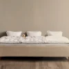Wir haben den Sockel bewusst niedriger gestaltet, denn zusätzliche Höhe bietet keinen zusätzlichen Komfort – und in einem Familienbett ist es wichtiger, dass die Kleinen selbstständig ein- und aussteigen können. Sollte doch einmal etwas passieren, ist der Fallweg auch nicht so groß. Aus Umwelt- und Nachhaltigkeitsgründen verwenden wir recycelten Schaumstoff und FSC-zertifiziertes Holz.
