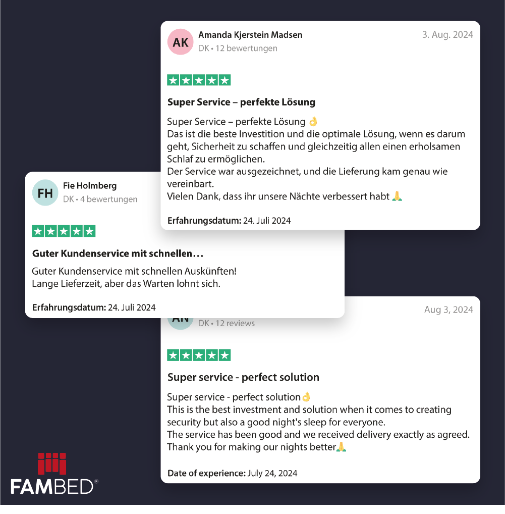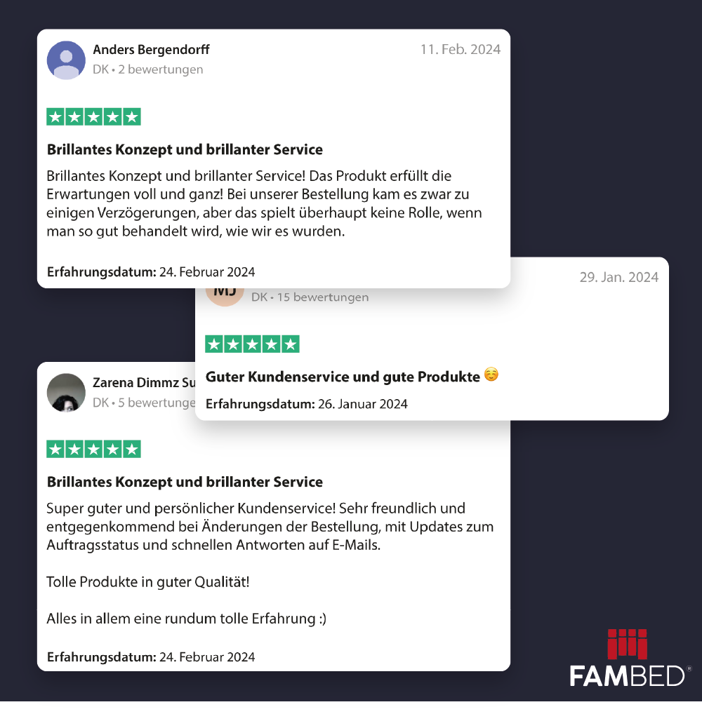 Wir sind auf FAMBED gestoßen und haben uns – trotz etwas längerer Lieferzeit – bestens betreut gefühlt. Das Produkt ist hochwertig und durchdacht gestaltet. Endlich haben wir das Schlafzimmer, von dem wir geträumt haben, und außerdem schlafen wir jetzt alle viel besser! 🤗 Sehr zu empfehlen für alle Familien mit Kindern.